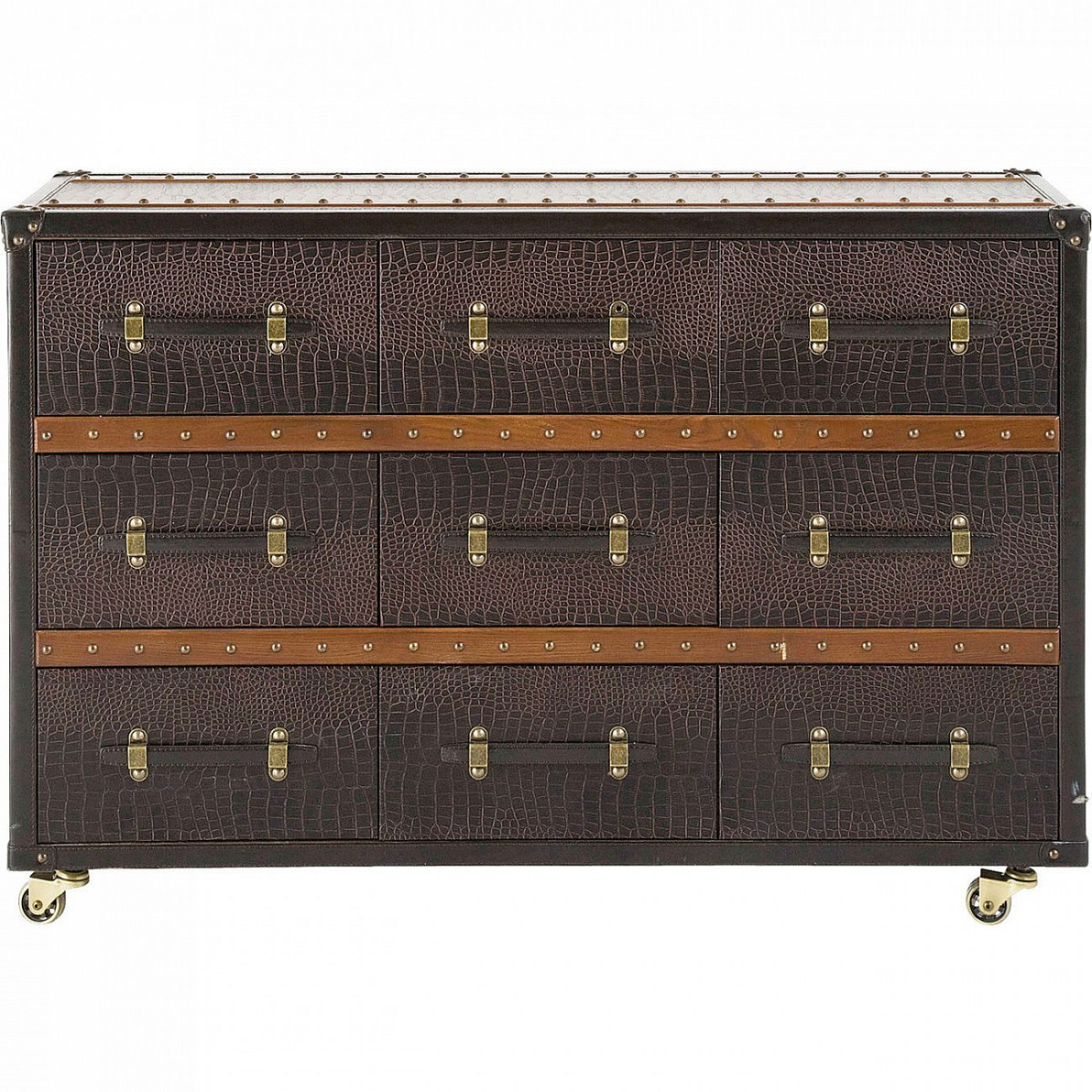 После путешествия по всему континенту или переходу Атлантического океана на пароходе, Вы возвращаетесь домой и видите классический интерьер путешественника. Такие комоды являются частью любимого интерьерного декорировани городских кочевников. Они излучают неповторимую ауру и элегантно воплощают стремление путешествовать к далеким берегам, в сочетании с духовным отношением к жизни и желанием смотреть далеко за пределы своих горизонтов. Благодаря своему космополитичному шарму такие люди у себя дома, а впрочем и везде, стараются окружить себя исключительно практичными вещами. Именно этот стиль жизни и вдохновил нас на создание комода Колониальный. Его многочисленные детали, такие как коричневая искусственная кожа под крокодила, оцинкованное железо на деталях комода, ручки, защитные уголкои и заклепки, теперь только напоминают о тех днях, когда путешествие было еще началом долгого приключения. В дополнение к своему очаровательному дизайну, у этого комода также имеется множество практических преимуществ. Девять ящиков располагают достаточным местом для необходимых вещей, в то время как колёсики делают комод мобильным и передвижным.
